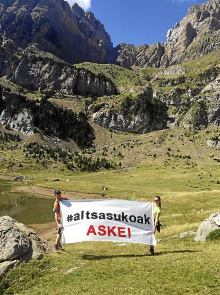 Ibon de Piedrafita mendian (1.242 metro) ateratako argazki hau igorri du Jon de Castrok. Jaka inguruan eman dituzte egun batzuk oporretan eta inguruko mendiak bisitatzeko parada ez dute galdu nahi izan. Mendiak sarri ematen duen askatasun sentsazio horren baitan, Altsasuko gazteen eta beste hainbat presoren aldeko indarra islatu nahi izan dutela argazki honen bitartez kontatu du De Castrok. Pitti-ttapa, ttipi-ttapa...