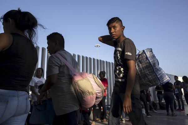 Boluntario bat Mexikotik AEBetara bidean doazen pertsonei janariz betetako poltsak banatzen.