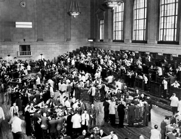 Según los cronistas de aquellos días, la sesión del jueves 24 de octubre en Wall Street comenzó tranquila pero enseguida el volumen de contratación comenzó a crecer y las cotizaciones de los valores a caer con fuerza. El pánico se apoderó de los especuladores y las acciones se empezaron a vender por nada. En aquellos tiempos la principal fuente de información bursátil era el ticker, un instrumento telegráfico que trasmitía las cotizaciones que iban imprimiéndose en una cinta. Hoy en día esa cinta se ha incorporado a muchas pantallas de canales informativos a modo de banda móvil donde se va dando cuenta de la información de la bolsa. El gran volumen de operaciones de ese día provocó el retraso del ticker, contribuyendo a que aumentara la inquietud. A diferencia de cuando se esperan ganancias –los retrasos no importan gran cosa, el beneficio será más o menos grande, pero habrá–, cuando se esperan pérdidas suele ser importante saber la dimensión del estropicio cuanto antes, y cualquier retraso no hace sino aumentar el nerviosismo.