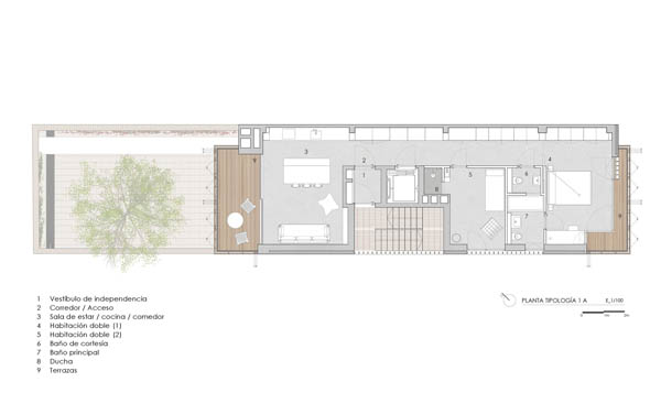 Las estrategias de eficiencia energética utilizadas arrojan la calificación de demanda y consumo más eficaz, la letra “A”. Para tal efecto, mezclan estrategias modernas –10 centímetros de aislamiento en fachada– con tradicionales, provenientes de la arquitectura vernácula catalana como, por ejemplo, la celosía cerámica rectangular que cierra la escalera comunitaria, que permite una correcta ventilación y refresco del edificio, generando un tiro térmico en toda la escalera.
