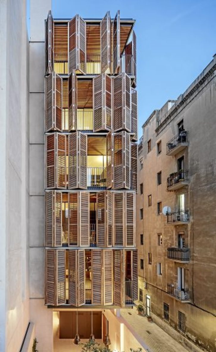 Haciendo un salto hacia adelante de siete años, vemos cómo el proyecto de Poblenou destaca por unas fachadas que usan postigos o contraventanas correderas como un elemento formal que, abriendo y cerrando, dan gran movimiento a la fachada y al tiempo llaman la memoria de las antiguas fábricas del barrio barcelonés.