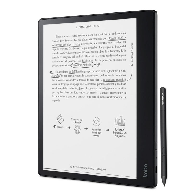 El último eReader de Kobo no solo sirve para leer libros electrónicos, sino que además permite tomar notas, resaltar textos y funcionar como un cuaderno. Para ello cuenta con una pantalla Carta 1200 E-Ink táctil de 10,3 pulgadas sin reflejos e incluye un lápiz Kobo Stylus.