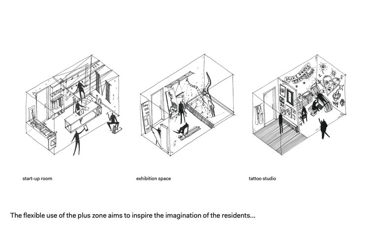 El segundo nivel de privacidad, todavía un espacio de carácter comunitario pero más acotado, lo conforma un espacio que los arquitectos han denominado “plus space”, y que es un recinto, de aproximadamente 15 metros cuadrados, que sirve de acceso a la vivienda, pero que está pensado para que se pueda montar un estudio de escultura, una pequeña tienda, un salón de tatuajes, una oficina… o simplemente una zona de reunión o lectura. El tercer nivel de privacidad, ya en el interior de la vivienda, lo conforman la cocina y las zonas húmedas de la casa, y tras eso, ya en el último nivel de privacidad, la zona de estar y las habitaciones, que vuelcan hacia la fachada exterior.
