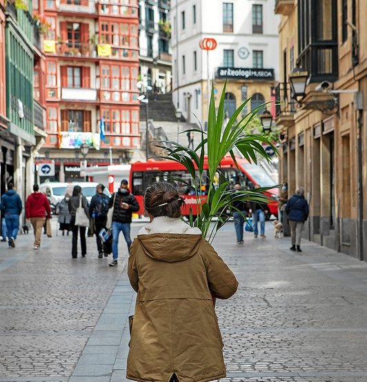 A principios de enero, la artista Maider López (Donostia, 1975) inauguró en la Alhóndiga de Bilbo una muestra basada en su proyecto “Personaje”. La instalación consta de diferentes elementos que documentan una acción realizada en las calles de la ciudad entre el 12 de abril y el 16 de mayo de este mismo año. Más de 30 fotografías, dos piezas de vídeo y un plano sirven para documentar el recorrido que una mujer anónima realiza exactamente de la misma manera durante 30 días. En cada uno de ellos, su paseo recorre los mismo lugares, transitando las mismas aceras y sentándose en el mismo banco. En las fotografías, nuestra protagonista porta a la altura del pecho una planta de tallo alto de un color verde intenso, como un elemento que le diferencia del resto de personas que conforman el flujo de la ciudad. La repetición como toma de consciencia del espacio que se habita. El gesto artístico aparece en un segundo plano, aparentemente inactivo durante la rutina de su proceder. La vida y el arte se igualan para fundirse en una misma capa, conviviendo en un trajín de cruces, semáforos y ruido. La lógica de lo urbano domina los traslados y condiciona a la pareja que conforman la mujer y la planta. Nada es aparentemente reseñable en un acto tan simple como el desplazarse de un lugar a otro. Pero, entonces, el dispositivo del arte entra en juego. Es capaz de rescatar un instante y señalarlo. Asumir que, por volátil que sea, hay una carga política en el propio hecho de atravesar una ciudad una y otra vez, pues nos permite disparar reflexiones en torno al espacio público, la lógicas urbanísticas o los comportamientos sociales. La pregunta es si seríamos capaces de darnos cuenta de ello si la obra de arte no estuviera aquí para mostrarlo.
