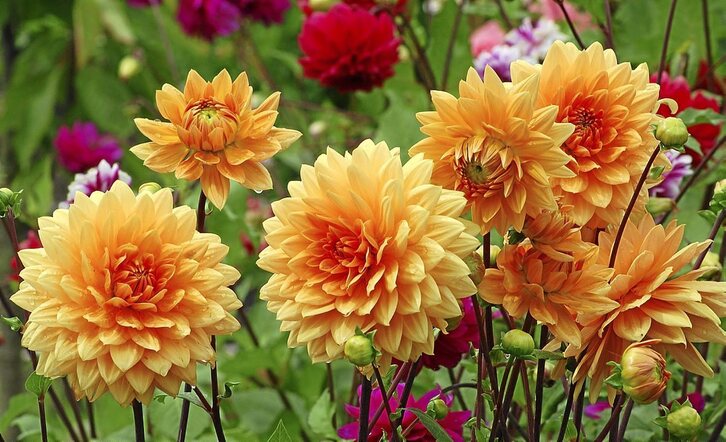 Las dalias son unas flores muy llamativas, apropiadas para su cultivo en el jardín en arriates mixtos; combinan muy bien con anuales y vivaces y nos ofrecen muchas variedades. Así, por ejemplo, están la “Cornel Bronze” con forma de pompón, que es la flor clásica de las dalias y resulta muy original con pétalos curvados hacia dentro; la “Angora” es parecida a un clavel; la “Comet” recuerda a las anémonas y en la “Alvas Suprema” sus flores grandes pueden llegar a los 30 cms.