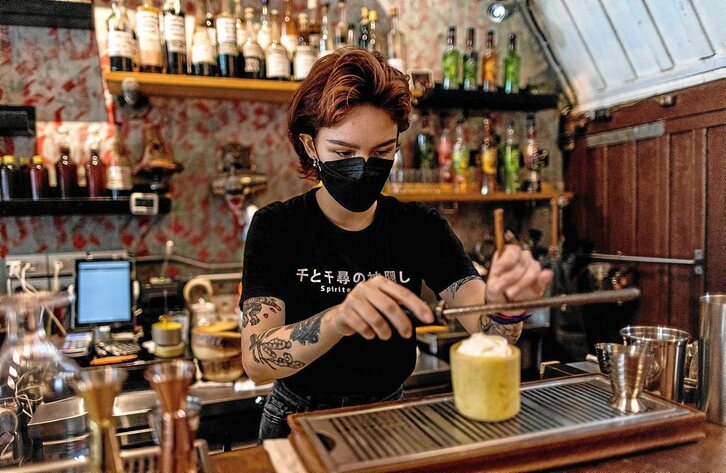 Algunos bares de Bangkok han encontrado una “alternativa” a la prohibición temporal de servir alcohol en tiempos de covid, cuya venta actualmente está prohibida en Tailandia. Se llama kratom (Mitragyna speciosa) y es una planta tropical de la misma familia que el café con efectos estimulantes en pequeñas dosis, sedantes en altas dosis y droga recreacional que además se usa en la medicina tradicional como anestésico contra el dolor, la ansiedad, el insomnio, la diarrea e incluso frente a la adicción a los opiáceos, ya que sus efectos son más suaves. Utilizada durante siglos en el sudeste asiático, fue retirada de la lista de productos prohibidos por el Gobierno tailandés el pasado agosto. En bares como el de la fotografía se ofrece en cócteles llamados mocktails (cócteles sin alcohol), cada vez más populares, a casi cuatro euros la copa frente a los diez que cuesta un Gin Tonic. El sector, muy tocado por la ausencia de turismo, se prepara para la reapertura tras meses de inactividad nocturna para combatir la propagación del coronavirus en un país que ha registrado 1,7 millones de casos. Los dueños de algunos negocios han ignorado la prohibición y han servido alcohol disimulado en recipientes como tazas o latas de refrescos. Otros se han lanzado a la coctelería. Aseguran que el sabor amargo de las hojas de kratom, que también se mastican, equilibra la dulzura de otros ingredientes. Hay combinaciones múltiples. Un cliente que degusta un cóctel de kratom, agua con gas y lima describe: «Sabe a ciruela picante. Es refrescante».