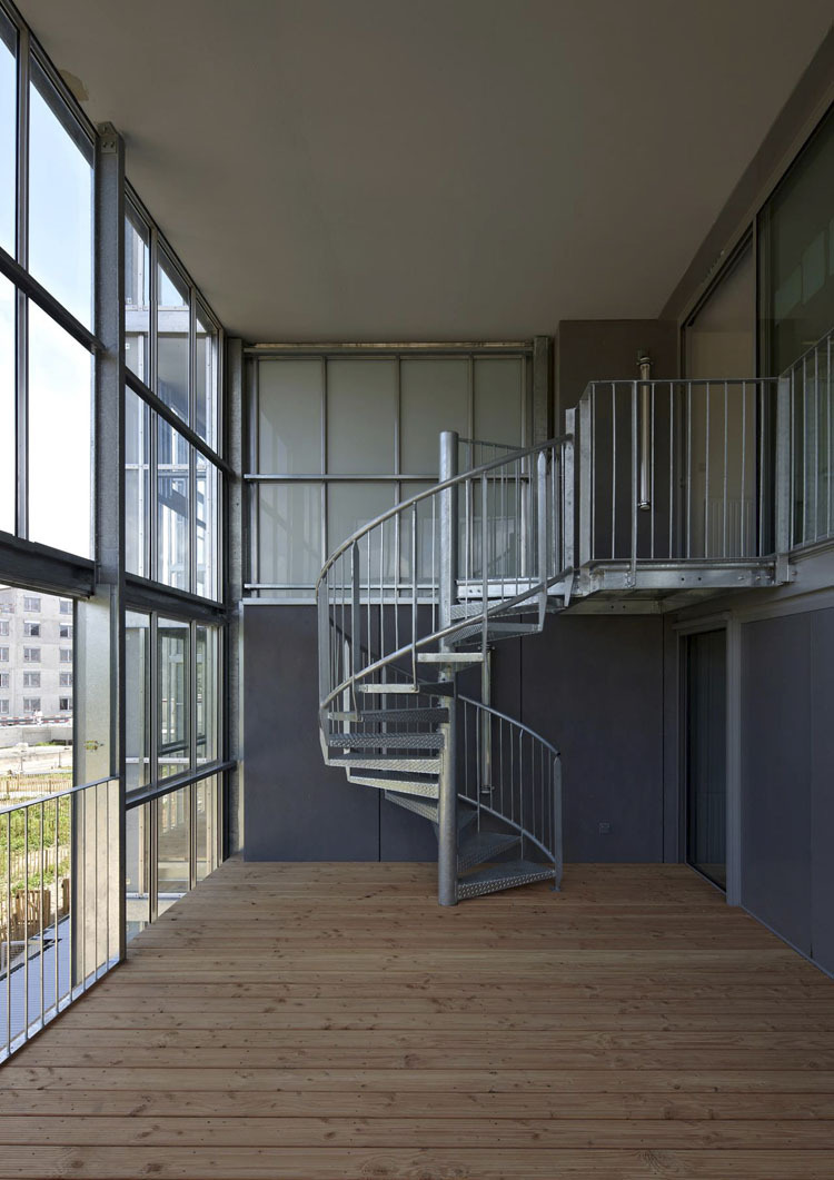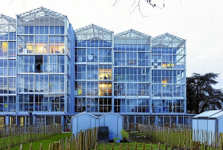 Invernadero. Si algo caracteriza la imagen exterior de estas viviendas, es el invernadero que precede a su fachada. Ampliando los espacios interiores de la casa, esta pieza dota a cada vivienda de una superficie adicional y, en el caso de los dúplex, de un volumen a doble altura que permite otros modos de habitar. Preservando a cada vivienda el contacto visual directo con las viviendas vecinas, estableciendo así una cierta articulación de lo colectivo. Este invernadero proporciona además un elemento determinante para el confort climático de los habitantes, a la vez que contribuye positivamente al balance energético de cada vivienda.