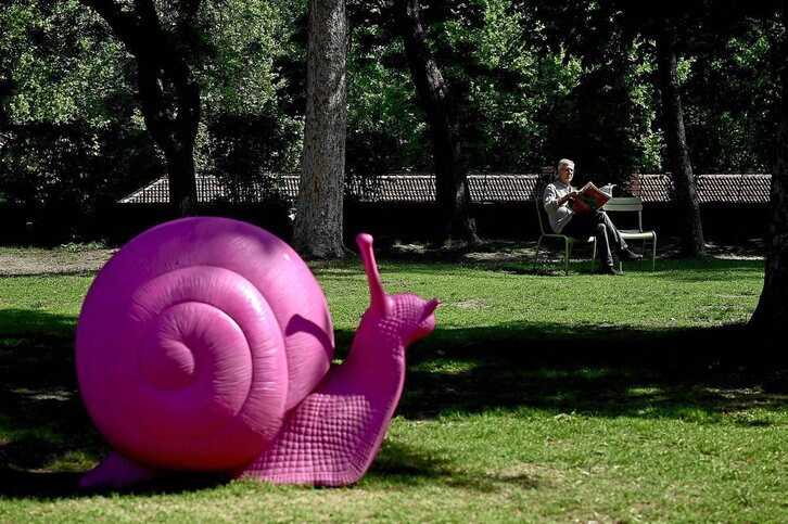 Es una idea bastante extendida y a la vez comprobable esa de que la felicidad está en las cosas sencillas. Leer al aire libre, sentado en un banco cuando despunta la primavera, todavía sigue siendo uno de los placeres asequibles de la vida. Ya lo dijo Cicéron: «Si cerca de la biblioteca tenéis un jardín, ya no os faltará de nada». Y, en realidad, ni siquiera hace falta que la biblioteca y el jardín sean tuyos, para eso están las bibliotecas y jardines municipales o públicos. Y hasta los Jardines Reales como este de Turín, que aparece en la imagen, donde al fondo hay un hombre concentrado en las hojas del periódico que no levanta la mirada ni siquiera ante la presencia de este enorme y vistoso caracol rosa que contrasta con las maravillas naturales y la tranquilidad que emana ese lugar de la capital piamontesa. Diseñados por André le Nôtre, el mismo que planificó los jardines de Versalles, cuatro siglos después de su creación lucen parecidos en la ciudad italiana. En plena era digital, lo de aprovechar cualquier momento para sacar el libro, el periódico, esta misma revista o cualquier soporte de papel y disfrutar de la lectura bajo el sol o a la sombra de esos árboles centenarios que como los de Turín también encontramos en nuestras tierras, no es ninguna rareza. Aunque a este paso, y no al del caracol, terminará siéndolo. El papel se encarece, escasea... ¿tendrá ya fecha de caducidad? Aprovechen mientras puedan.