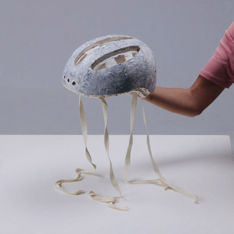 La oficina de diseño holandesa Studio MOM ha desarrollado un casco de bicicleta a partir de biomateriales que, a diferencia de los cascos de poliestireno, se puede producir sin combustibles fósiles y compostar después de su uso.