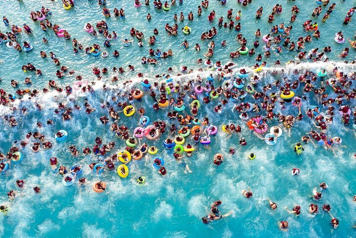 ¿Refrescante, divertido o colorido? Cualquiera de las tres definiciones se ajusta a esta imagen tomada en un parque acuático chino que ha terminado convirtiéndose en un clásico del verano. La secuencia se repite anualmente cuando para combatir las altas temperaturas que azotan durante estos meses medio mundo, el personal se refresca en mares, lagos, ríos, pantanos o piscinas. En las zonas del gigante asiático son especialmente partidarios del flotador, así que la población se zambulle por diversión y para hacer frente al calor entre esos artilugios de plástico, corcho o pvc convirtiendo el sitio en un estallido de color. Esta foto aérea está tomada en una pileta del parque acuático de Zhengzhou, la capital de la provincia de Henan, un lugar donde los veranos son largos y calurosos. Incluso emblemáticos recintos como el Cubo de Agua, la legendaria piscina que acogió los Juegos Olímpicos de 2008 y donde Michael Phelps se colgó ocho medallas de oro, sucumbió a la tentanción de convertirse al año siguiente en piscina veraniega abierta al público, previo paso por taquilla. Pequineses y turistas disfrutaron entonces de un escenario legendario que sigue reciclándose dependiendo del momento. Aprovechando la instalación, durante los últimos Juegos de Invierno celebrados en Pekin, este 2022 se reconvirtió en pista de curling. Con el mercurio superando los 40 grados, estos recintos son la alternativa, con o sin flotador.