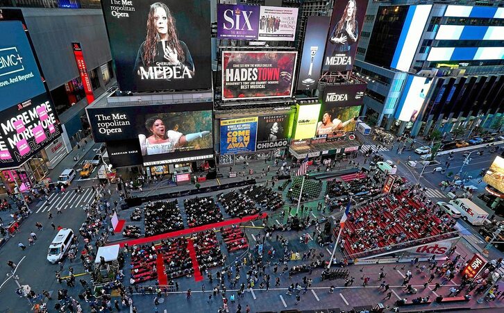 Ópera en la calle, aunque sea transmitida a través de pantallas gigantes. La gente se reúne en Times Square para asistir a la representación de “Medea”, obra en tres actos del compositor italiano Luigi Cherubini en un acto organizado por Metropolitan Opera House. La Ópera Metropolitana de Nueva York, más conocida como Met, está considerada la institución más importante de música clásica de Estados Unidos. La iniciativa no está relacionada con la postpandemia y se repite desde hace 16 años coincidiendo con la apertura de la temporada en el Lincoln Center, uno de los templos mundiales del bel canto en el que anualmente superan las doscientas representaciones desde finales de setiembre a mayo. Esta retransmisión es gratis, así que hay quien se sienta, se queda de pie o pasa de largo ante la voz de Sondra Radvanovsky que esta vez interpreta a la legendaria hechicera que no se detendrá ante nada en su búsqueda de venganza. “Medea” fue el papel que consagró para siempre a la inolvidable Maria Calas, la soprano de origen griego nacida precisamente en Manhattan. Calas llegó a adelgazar 30 kilos «para hacerle justicia al personaje», dijo, y encarnarla en teatros y hasta interpretarla en el cine de la mano de Pasolini. ¿Qué diría la diva de esta otra puesta en escena en su casa?