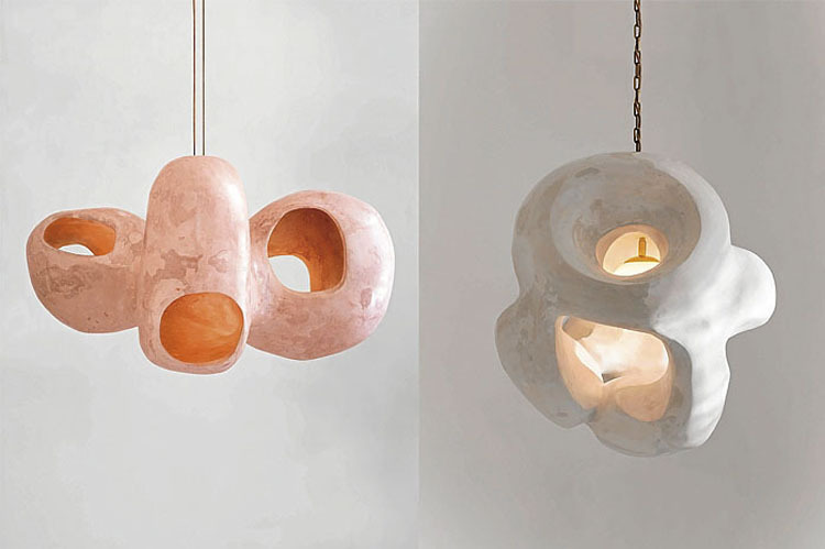 Diseñadas por AOAO, un estudio interdisciplinario en Ámsterdam fundado por Alicja Stryzynska y Onur Iseri, Wonder Things es una serie de accesorios iluminados escultóricos que están diseñados para evocar la introspección y la autoreflexión. La colección, que actualmente consta de dos piezas, está inspirada en los conceptos tradicionales japoneses: ikigai y bosei. La pieza más grande de la colección es Bosei, que se traduce en “maternidad”. AOAO quería crear un objeto que representara tanto la protección como la comodidad, por lo que diseñaron una forma que se ve y se siente diferente por ambos lados para representar estas dos cualidades de la maternidad. También hechas con yeso, las paredes de la lámpara están reforzadas con malla metálica y fibra de vidrio para soportar los recortes de la lámpara. La carcasa exterior parece bastante monolítica y resistente, simbolizando la protección, mientras que el interior de la lámpara brilla con tonos naranja dorados, creando una sensación de comodidad y calma. El concepto japonés de Ikigai se traduce aproximadamente como “el propósito de la vida”, que sirve de inspiración para la lámpara. AOAO quería diseñar una pieza contemporánea para representar esta filosofía del bienestar, por lo que crearon una forma única hecha de yeso que revela una luz interior. Esta luz se extiende por todo el objeto, iluminando las superficies multi tonadas de manera diferente desde diferentes ángulos. El concepto es una metáfora física de que nuestra propia luz interior, el propósito de nuestra verdadera vida, puede ocultarse profundamente. https://aoao.nl/
