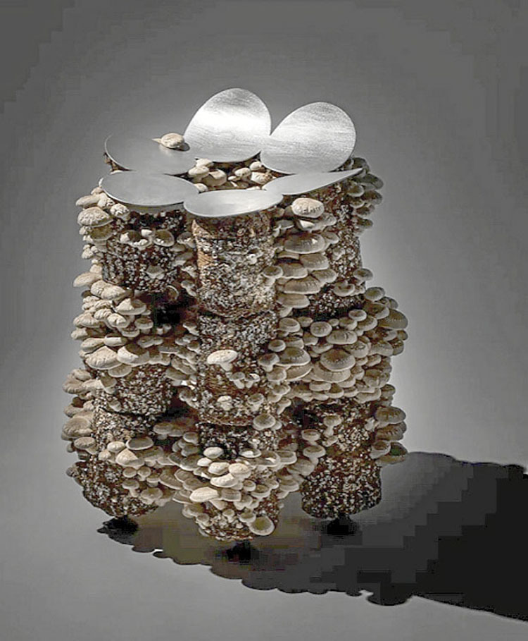 El taburete de hongos de Satoshi Itasaka destaca la importancia de preservar los descomponedores de hongos, ya que desempeñan un papel crucial en nuestro ecosistema. También propone una dirección más sostenible para el diseño de muebles. Su asiento está hecho de un círculo de seis discos que se parecen un poco a las tapas de setas acurrucadas una al lado de la otra. «Hay alrededor de 100 billones de bacterias en nuestros cuerpos», explica el diseñador del producto. «Por lo tanto, vivimos en simbiosis con aproximadamente tres veces más bacterias que nuestras propias células. Aunque a veces somos atormentados por las bacterias, el entorno en el que vivimos no sería posible sin descomponedores como hongos y bacterias. El mundo está en medio de un auge de la desinfección, pero diseñé un dispositivo para aprender más sobre estos descomponedores, no para deshacerme de ellos. Descubrí que los hongos crecieron inesperadamente en ese aparato. Los hongos crecieron y florecieron como flores, produciendo numerosos y hermosos hongos». www.h220430.jp