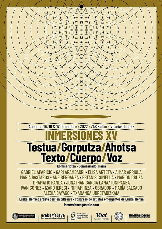 El colectivo comisarial Haria ha sido el encargado de plantear este aniversario y para ello ha propuesto un marco conceptual acotado por tres conceptos, “texto, cuerpo y voz”. Una manera de atender a aquellas prácticas que profundizan en la relación entre la escritura, la performatividad y la interpretación sonora o vocal como prácticas expandidas que se entrelazan. Inmersiones número quince se celebra en la sede de Zas Kultur de Gasteiz los días 15, 16 y 17 de diciembre. El primer día, el artista Iván Gómez presentará un proceso realizado en varios centros educativos de la capital alavesa a través de un video-ensayo en torno a la idea del desecho como material escultórico. El viernes, la escritora y comisaria María Bastarós impartirá la conferencia inaugural del encuentro que vivirá su plato fuerte el sábado en una jornada que se extenderá desde la mañana hasta la tarde y que ofrecerá presentaciones, acciones y performances El evento del sábado cuenta con un elenco invitado conformado por Maria Salgado, Aimar Arriola, Marion Cruza, Colectivo OBRADOR, Estanis Comella, Dramatic Panda y la Txaranga Urretabizkaia. Estos nombres compartirán programa con el resultado de la selección realizada tras la convocatoria puesta en marcha en octubre y desde la que seleccionó a Alexia Sayago, Gabriel Aparicio, Elisa Arteta, Ane Berganza, Gari Aranbarri, Izaro Ieregi, Jonathan García Lana / Tunipanea y Miriam Inza. Sin duda, una oportunidad inmejorable para acercarnos a las prácticas que artistas y agentes de nuestro territorio están llevando a cabo y conocer un proyecto tan necesario y relevante como Inmersiones.