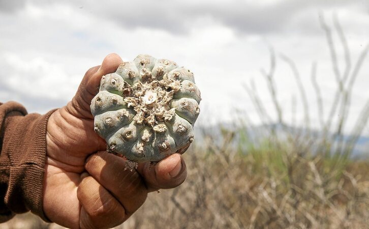 La Lophophora Williamsii crece a ras de suelo, escondida bajo los matorrales en el desierto en el norte de México y el sur de Estados Unidos. Su principal agente psicoactivo es la mescalina, un alcaloide del grupo de las feniletilaminas que interactúa con los receptores de serotonina. Esta sustancia natural provoca cambios de percepción y experiencias trascendentales. Los objetos pierden su consistencia y las leyes de la física se ven alteradas, al menos en la cabeza del consumidor, durante las horas en las que este experimenta el viaje. En 1897 fue aislada por primera vez y en 1919 se sintetizó en laboratorio. Durante décadas, su psicodelia fascinó a culturas occidentales, antes de la llegada del LSD.