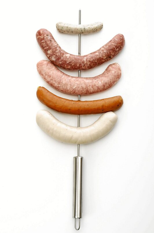 Bien, no todo es tan sencillo. Existen más de 1.500 variedades o tipos de salchicha en Alemania. Y una de las claves está en el análisis del nombre de esta: wurst. La traducción simplista e infravaloradora que hacemos, entendiendo wurst como salchicha, dice mucho de cómo generalizamos sin profundizar en culturas ajenas. En Alemania, la palabra wurst también implica todo preparado cárnico de cerdo o vacuno aderezado o adobado de diferentes maneras. Aquí se abre un abanico infinito en el que se entiende que la palabra wurst es la referencia más cercana a la charcutería que nos podamos topar. Wurst es todo un arte en el que se tratan de 1.500 maneras una idea, una manera de cocinar y que, hasta ahora, hemos generalizado de manera totalmente inconsciente. De este hecho podéis entender que cada prefijo o sufijo que se añada a esta palabra nos esté dando información sobre el producto en cuestión. Existen dos familias: las brüwurst (escaldadas) y bratwurst (de asar o freir). A partir de esta división por tipos de cocinado, empieza la variedad infinita de wurst existentes: Bratwurst (de tripa fina y natural), bierwurst (enebro y cardamomo), blutwurst (de sangre), bockwurst (tamaño grueso, pimentón y pimienta), Knackwurst (ahumada), Fleischwurst, Wienerwurst (con cilantro y ajo), Weisswurst (blanca)…y así, hasta el infinito y más allá.