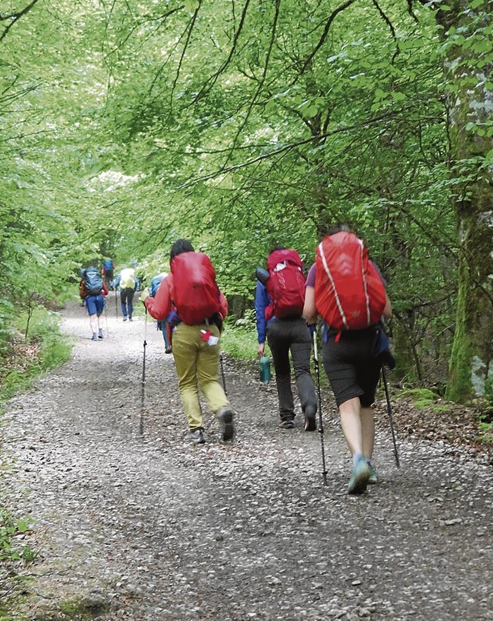 Donejakue bidean urteak irauten duten laguntasun edo harreman sendoak sortzen dira, erromes askok bideko etapak batera egiten baitituzte. Argazkian, erromesak Mezkiritz mendatera iristear.