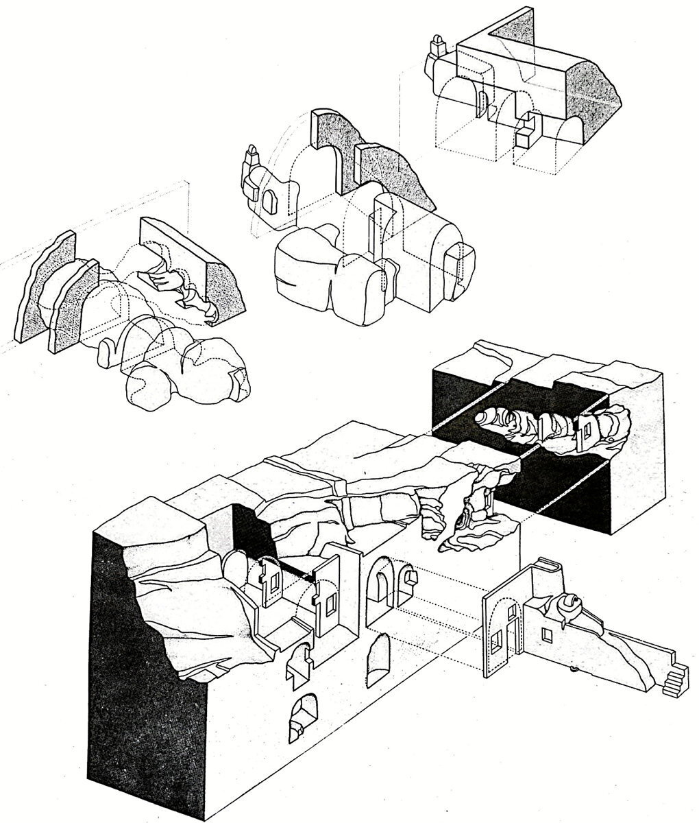 Hala ere, barne espazioaren eta kanpo arkitekturaren tratamendua zeharo ezberdina da. Haitzuloaren barnealdean kare geruza batek estaltzen dituen berezko forma naturalak mantentzen dira, kanpoaldean osagai geometriko perfektuak eraikitzen diren bitartean (adibidez, kupula eta horren aldaerak), lurrikaren aurkako eraikuntza teknika perfektuak suertatu direnak. Halaber, nabarmentzeko helburuz kokatzen dira osagai horiek guztiak, oparotasun adierazpen gisa; baina benetakoa ez den errealitatea islatzen dute, jatorrizko pobrezia disimulatzeko. Nolanahi ere, arkitekturaren agerpena espazioan goraipatu nahi da, kobatik at, euforia eta irudimena lagun.