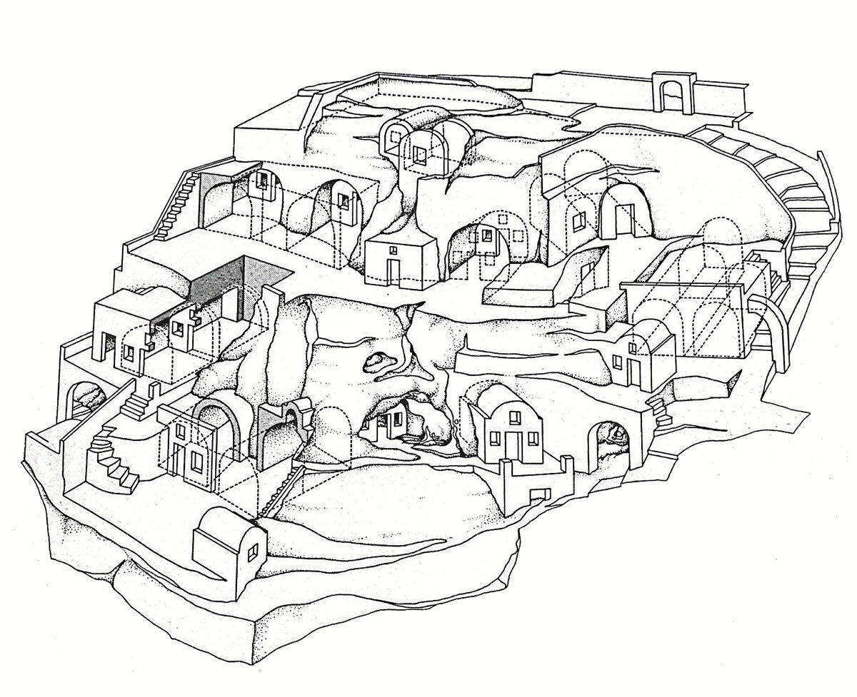 Santoriniko tradiziozko arkitekturak elkarrekin konektaturiko espazio pribatuen eta publikoen kate diakroniko etengabea sortzen du.