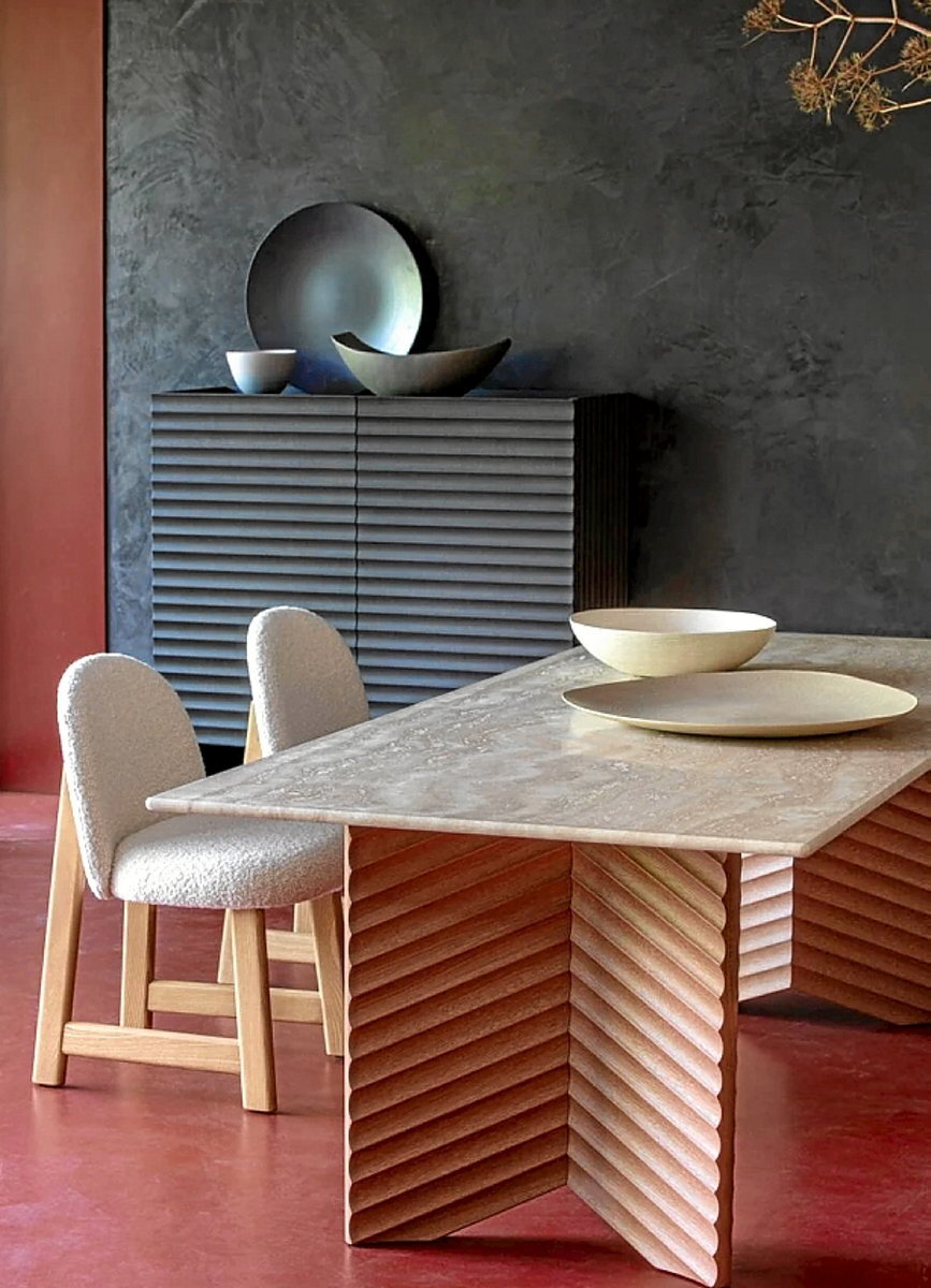 Patricia Urquiola vuelve a colaborar con Moroso en un dúo de mesas de madera caracterizadas por ranuras lineales talladas en sus superficies. Los patrones distintivos de las mesas Rows se inspiran en una pintura de naturaleza muerta de la escritora y pintora francesa Amédée Ozenfant y, mientras que “Table Diagonal” tiene patas que se inspiran en la cola de un milano, “Table Vertical” tiene patas rectas con líneas talladas que recuerdan a columnas arquitectónicas acanaladas. En ambos formatos, una viga horizontal soporta una amplia mesa destinada a cenar. Las mesas vienen en roble natural aceitado o pintado, en colores que incluyen gris carbón, canela, topo o verde bosque. Los materiales incluyen vidrio pintado en la parte posterior en arena, ámbar, verde bosque, rubor o espalda, así como una gama de mármoles sólidos con estrías naturales dinámicas.