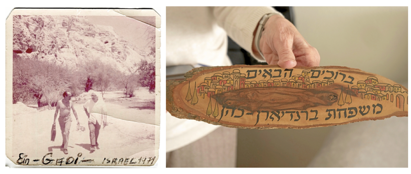 A la izquierda, caminando acompañado en una de sus visitas a Oriente Medio. A la derecha, un texto en hebreo que significa «Bienvenido a casa de los Barandiaran». Unai Aranzadi, Archivo familiar