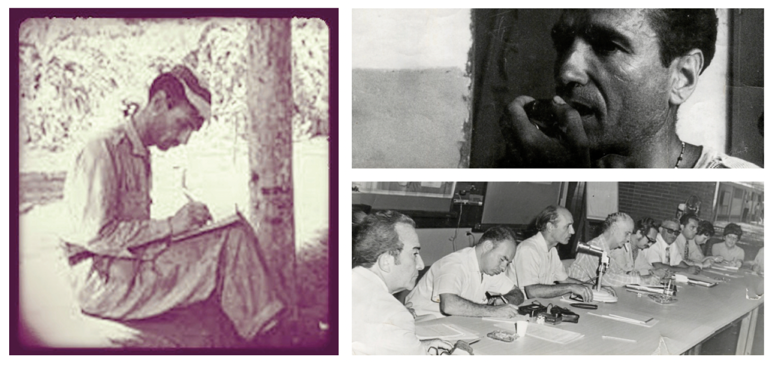Barandiaran en los años 50, trabajando como antropólogo en Venezuela; utilizando la radio para comunicarse desde la Orinoquía y en 1972, frente al micrófono mientras participaba en la III Conferencia sobre el mar de Venezuela. Archivo familiar