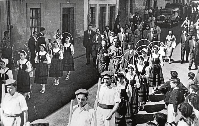 Bajo estas líneas, el antropólogo camina flanqueado por sus padres en un homenaje que le hizo el pueblo de Eskoriatza. Eskoriatzako Udala - Archivo Público