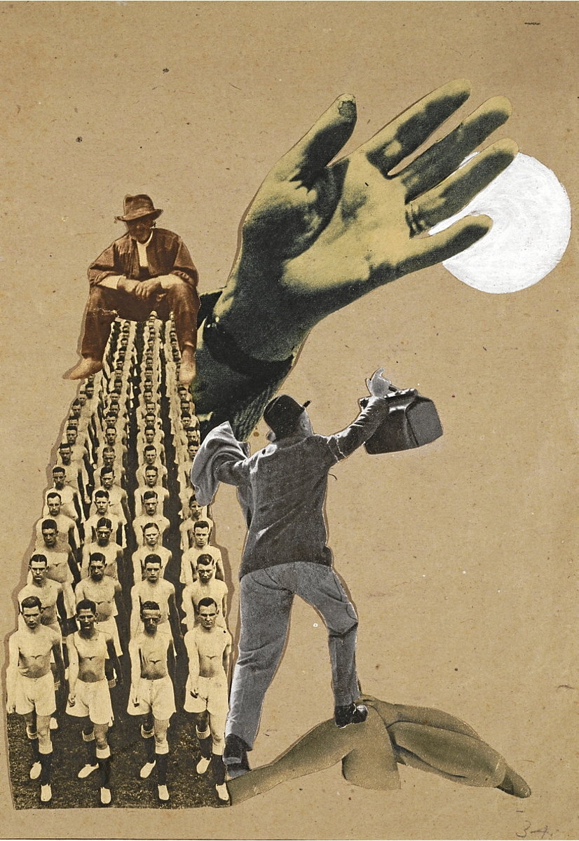 Campos prefiere trabajar solo y muchas de las veces elude las quedadas quincenales. Sus collages tienden hacia lecturas políticas y son sólidos, racionales, contundentes. «Primero necesito tener una idea muy clara sobre qué es lo que quiero -asegura-. Hay compañeros que, en tres horas, son capaces de completar una obra, que trabajan intuitivamente dialogando con las imágenes. Yo no funciono así. Busco los elementos específicamente. Suelo centrarme en un artista en concreto. Luego tengo que determinar el tamaño de cada elemento, su posición y la proporción… Me lleva meses. En algún caso, he estado un año».