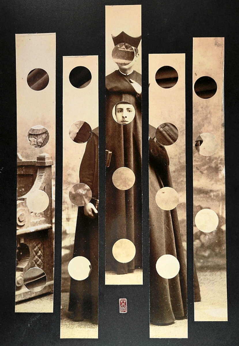 Este artista confiesa su afición por merodear por los rastros de viejo en busca de fotografías antiguas con las que construir sus mundos. Encontró, por ejemplo, imágenes de una familia de Dax sin identificar en un puestecito de la Plaza del Castillo. Las fotocopió, las cortó en tiras verticales y las recompuso, aunque ya no son del todo iguales. Repitió algunas tiras, las volteó «cara arriba» y «cara abajo», les añadió más ojos y las resignificó creando otra cosa. «No sé quiénes son, pero ahora me unen lazos invisibles con esta familia. Mientras trabajo con sus imágenes, fabulo con sus vidas. En esos ratos, el reloj y el móvil quedan en otra parte y el tiempo se me va. Me gusta trabajar pausado, a mi ritmo», continúa mientras prepara una próxima exposición con tatuajes como temática para exponerla en Elizondo.