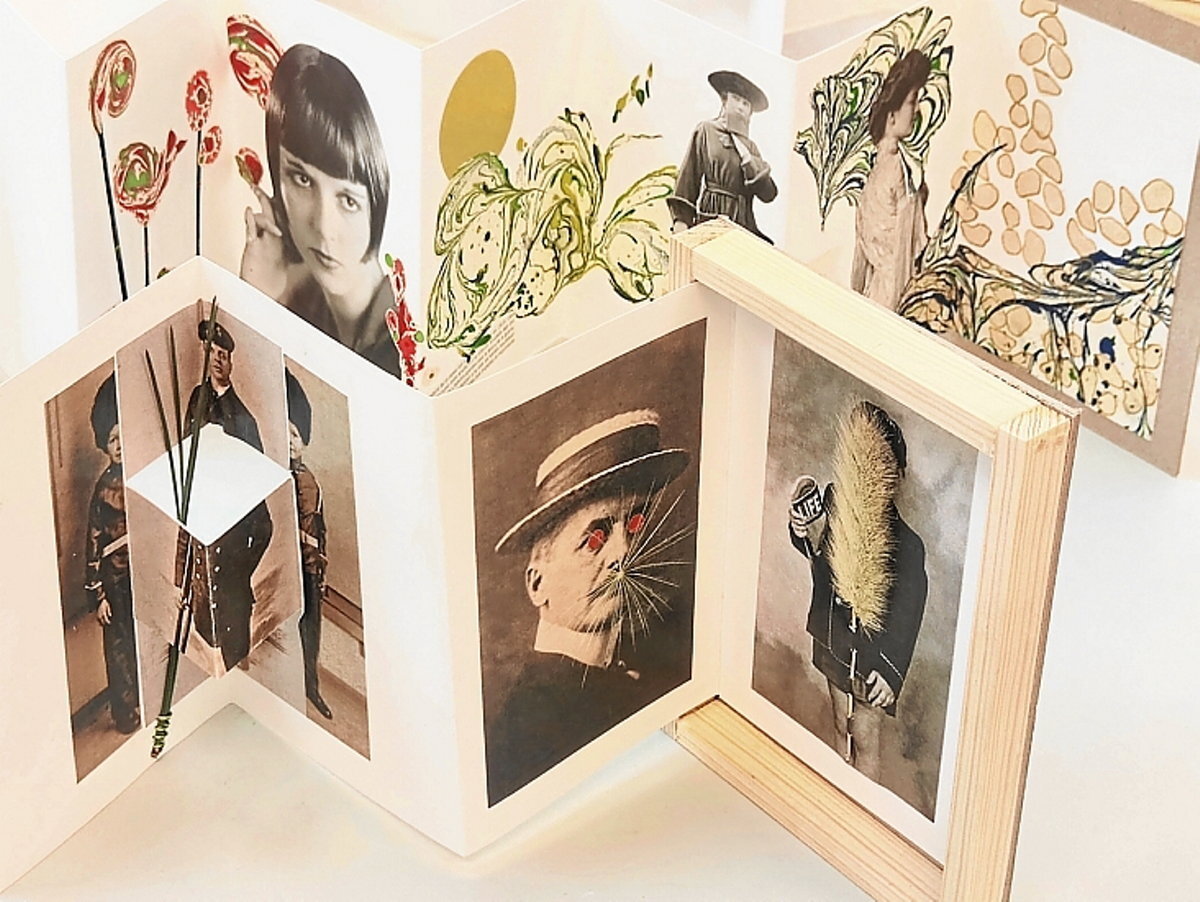 De Carlos realizó varias visitas guiadas a su exposición, una muestra que acabó acompañando a los libros. Mientras explicaba un collage y el siguiente que había compuesto durante un encierro que le resultó duro, lanzaba anzuelos a ver si, entre los asistentes, había algún otro artista del collage oculto o en potencia. ¡Y vaya si picaron! «Estaba íntimamente convencido de que no estaba solo. Me decía a mí mismo que tenía que haber más gente en Iruñea a la que le gustara el collage y, entre ellas, personas interesadas en hacerlo juntas», asegura De Carlos. A partir de ahí, los cruces de teléfonos, las primeras citas con revistas bajo el brazo, con carpetas llenas de imágenes encontradas aquí y allá, con las tijeras y el pegamento. Que no hace falta más.