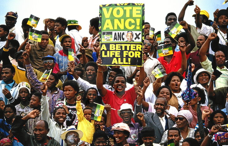 Tal día como hoy, un 27 de abril de 1994, Sudáfrica acogió sus primeras elecciones multirraciales en las que las personas de piel negra pudieron votar, poniendo fin al macabro período del apartheid. Aquellas elecciones generales duraron cuatro días, durante los cuales se sucedieron largas colas bajo el sol formadas por millones de ciudadanos -casi 20 millones- para ejercer su derecho al voto. El ganador fue el Congreso Nacional Africano (ANC), liderado por Nelson Mandela, y apoyado por el Partido Comunista de Sudáfrica (SACP) y el Congreso de Sindicatos Sudafricanos (COSATU). Obtuvieron el 62% de los votos, pero mantuvieron el pacto para formar gobierno tripartito con el Partido Nacional (PN) y el Partido de la Libertad Inkatha (PLI). Mandela votó en Natal después de visitar la tumba de John Dube, el primer presidente del ANC, partido que hasta cuatro años antes estaba ilegalizado. Antes de los comicios, en Soweto y en otros lugares del país, se invitó a la comunidad negra a votar. Hubo talleres y hasta obras de teatro tratando de acercarse a un tema que hasta entonces solo era cosa de blancos. En ese sentido, muchas personas participaron en las elecciones, incluso los más ancianos. Ese día, que se bautizó como Día de la Libertad, y ahora se celebra anualmente, ondeó por primera vez la bandera arcoíris. Esta imagen muestra a varios partidarios de Mandela, que fue nombrado presidente días después.