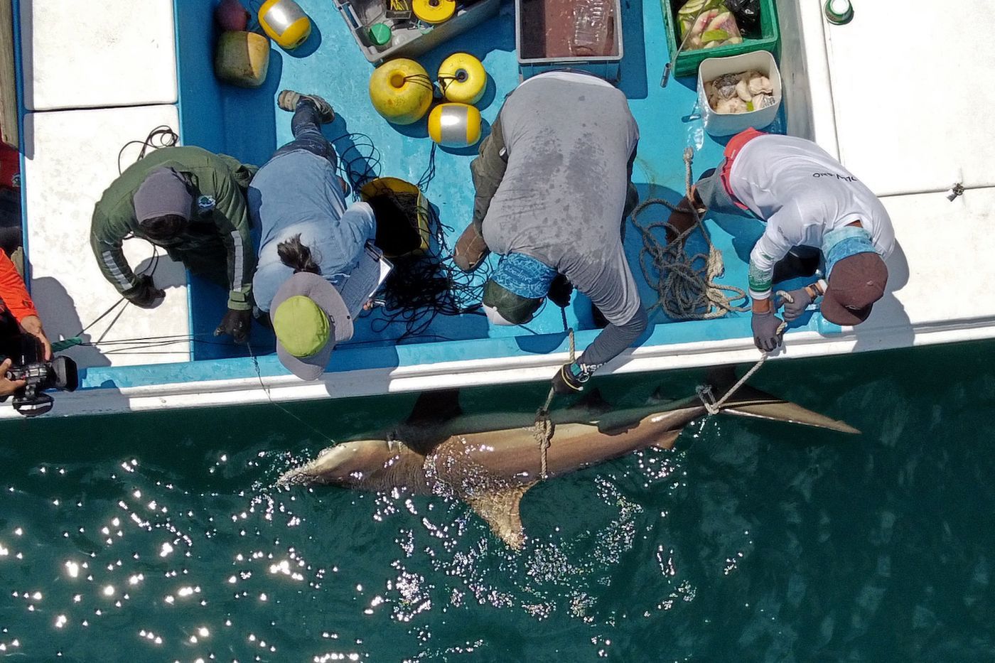 «Ikusten duzue? Han!», oihu egin du Alberto Proañok, itsasontzitik nahita botatako beita batek erakarritako marrazoa atzamarrez seinalatzen duen bitartean. 34 urteko biologoa da eta pita bota du. Amua limatuta dago ez minik ez kalterik eragin ez dezan. Oraingoan, hala ere, ez dago zorterik. Pelikano batek karnata lapurtu du bat-batean. Eta, noski, marrazoa ihesi joan da.