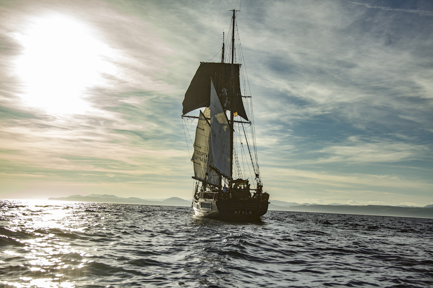 Proposamenak beste erakargarri handi bat ere bazuen: Atyla ontzia. Izan ere, ez da inolaz ere ohiko itsasontzia: 30 metro luze da eta 16 metroko bi masta altxatzen dira itsasontziaren bizkarretik, sokateria eta belak hedatuz eta XVIII. mende amaierako ontzietan inspiratutako goleta ederra marraztuz. Bertan nabigatzeak maniobrak iraganeko marinelek bezala egitea esan nahi du, 400 metro koadro bela muskulu hutsen indarrarekin zabaltzea, pilotu automatikoa ez izatea, gau eta egun lema eskuan izatea, etengabe begiak konpasean eta begirada brankan mantentzea. Azken batean, Atyla ontzian itsasoratzea ez da bidaia lasai baterako gonbidapenari baietza esatea, Poseidon berak botatako erronka onartzea baizik.