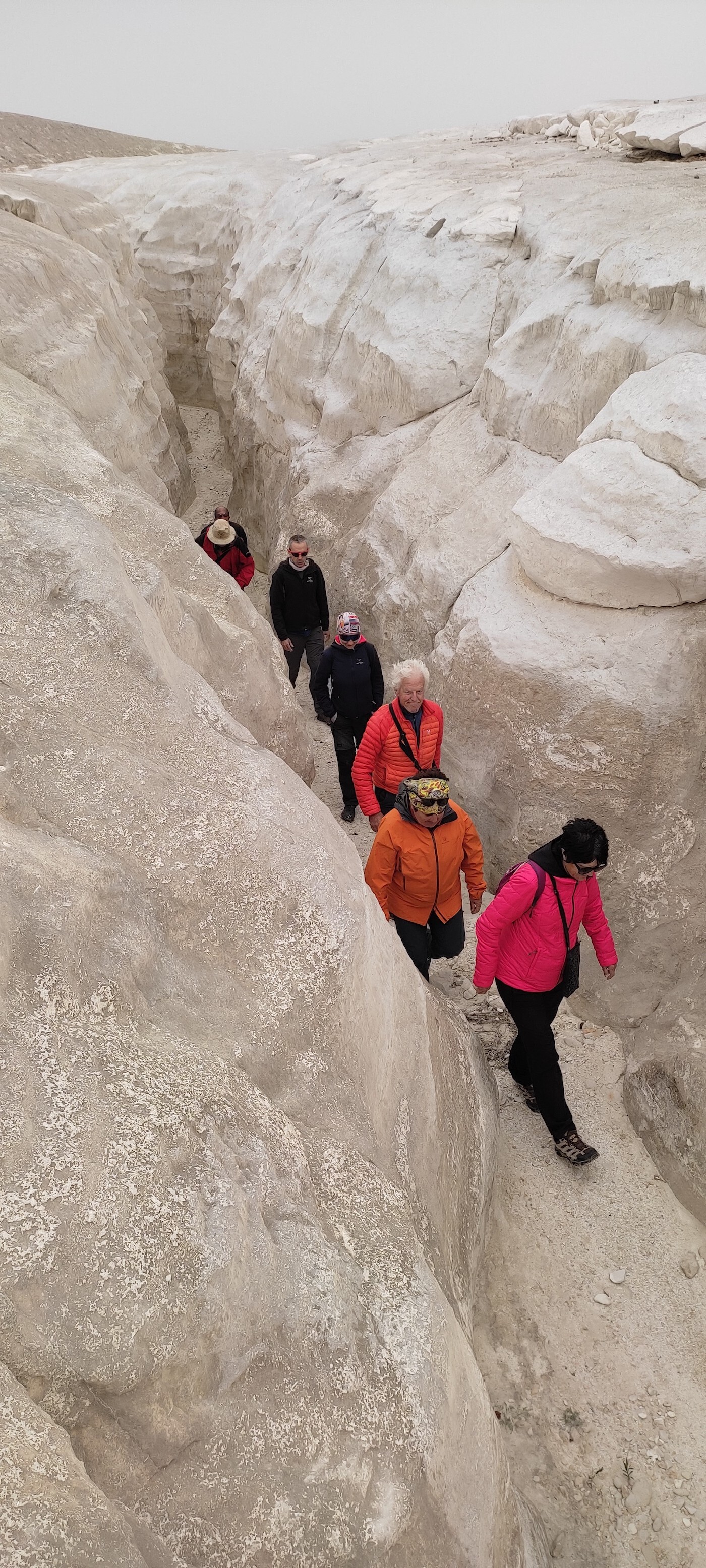 Oinez jaitsiko gara hondora, glaziar batean ibiliko bagina bezala, kretazko arrailak eta zuloak saihestuz eta altuera galduz era berean. Arratsalde osoa emango dugu paseatzen, laku-labarren mamu itxurak eta koloreak miresten; arku erraldoi batera heldu gara, gatzagako uretan botak sartu ditugu... Ilunabarrak gorriz eta morez tindatu du zerua, hodeiekin jolas harrigarri batean. Gauean, berriz, izar itsasoa zabaldu da gure buruen gainean.
