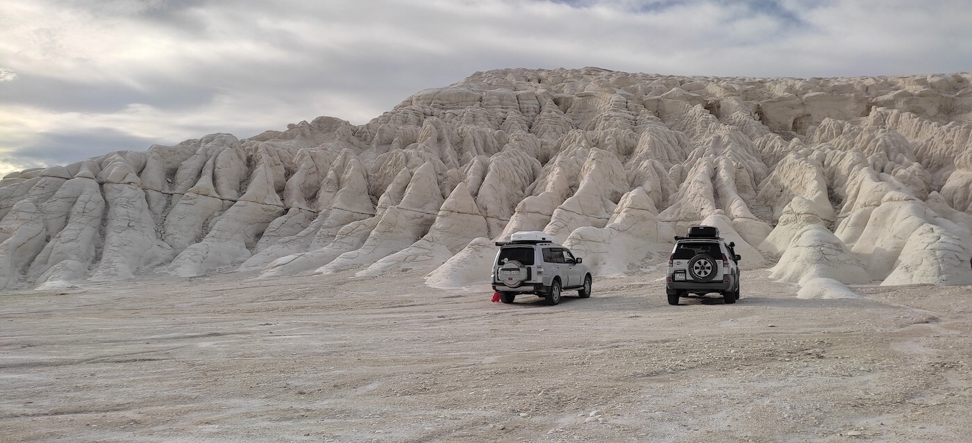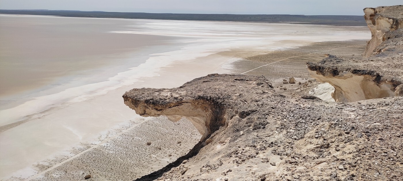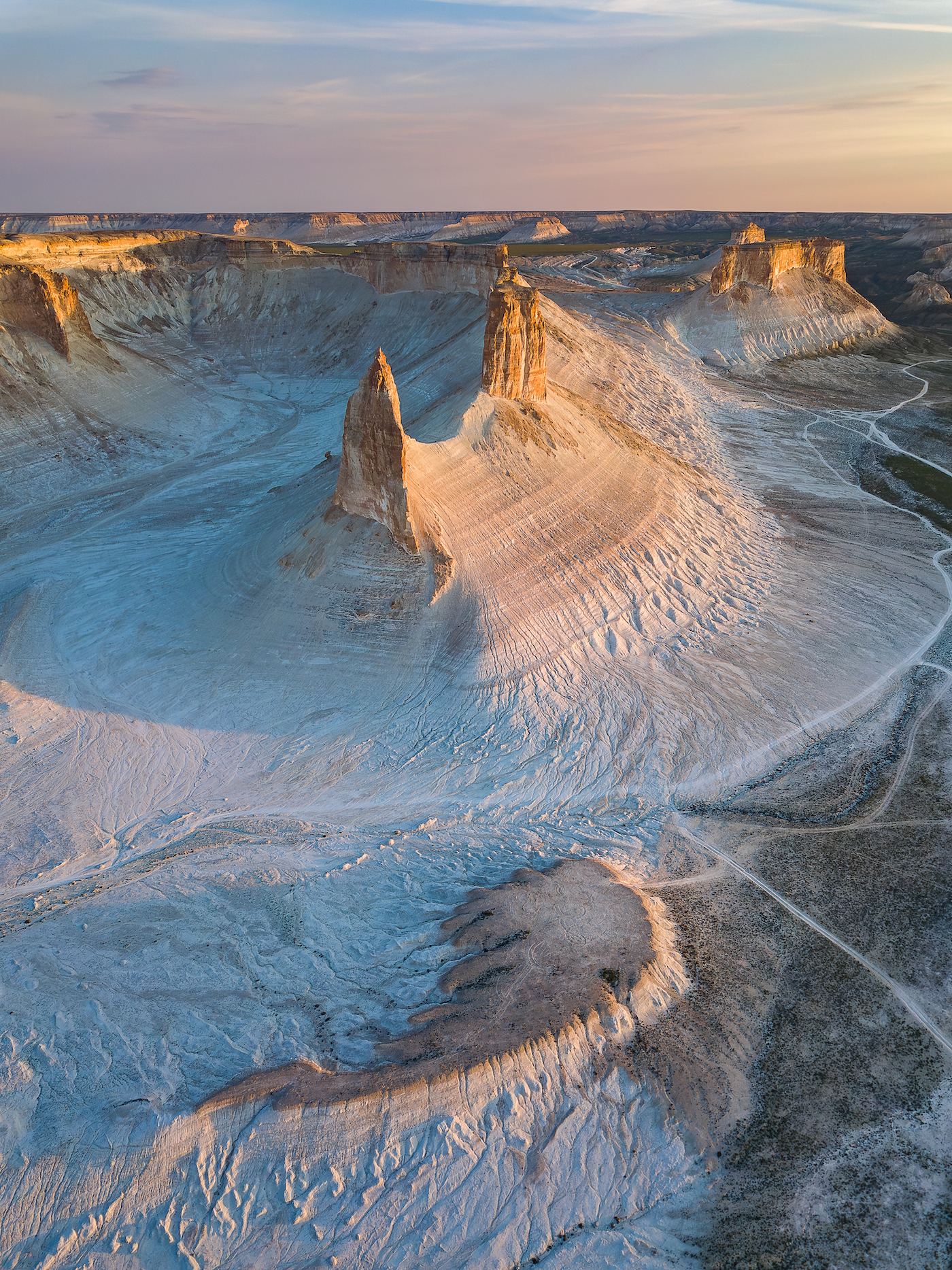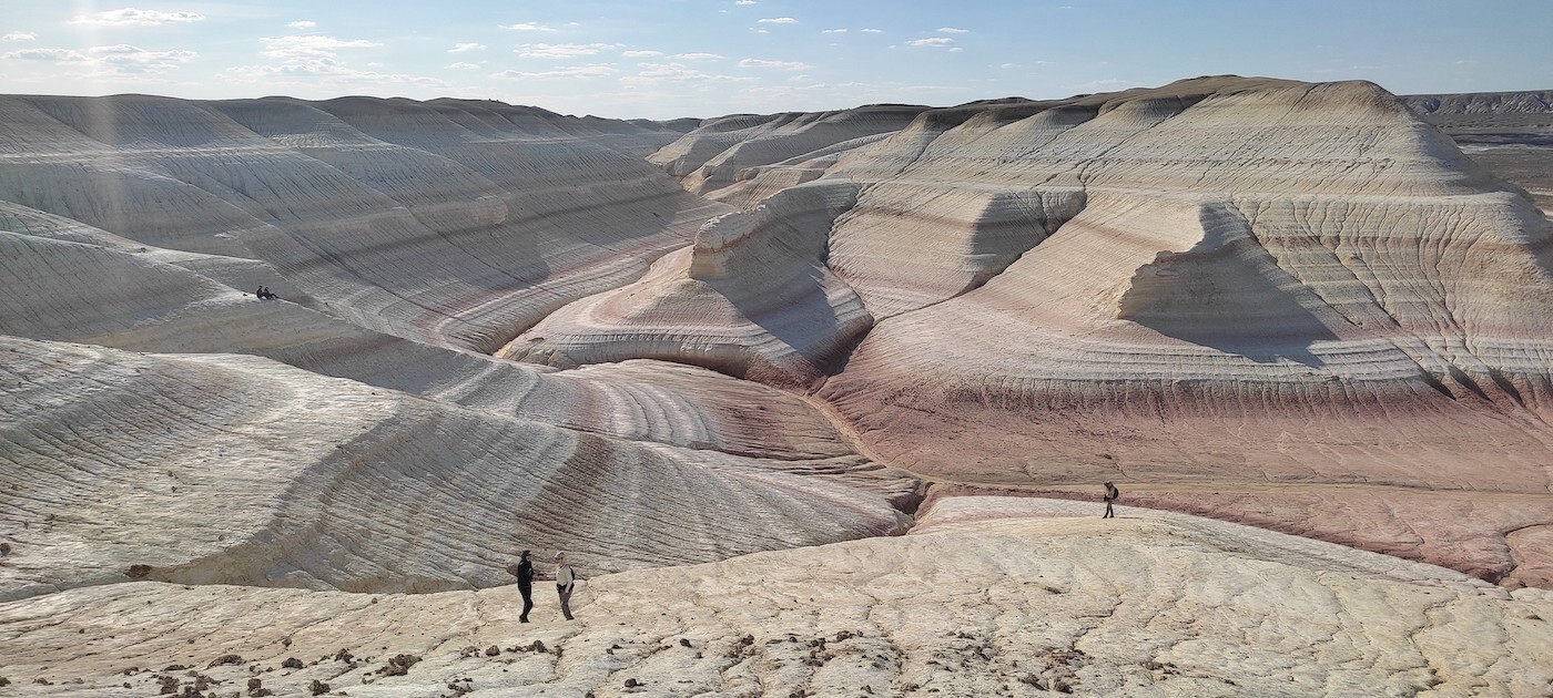 Mangystauko meka geologikoan gaude. Mesozoiko aroan bailara amaigabe hau guztia Tetis ozeanoak estaltzen zuen. Historia luzeko erosioaren ondorioz formazio geologiko harrigarria sortu da: 200 metrotik gorako mendixken eta labarren artean basamortu buztintsuak, kareharrizko mendi zuri eta isolatuak eta gatzagak ikusten dira. Hiazinto bioletaz beteriko zelai more bat zeharkatuz glaziar-zirku batean kanpatu dugu, haizearen babesean. Eta arrastiriak bere azken argi laranja eta arrosak oparitzen dizkigu.