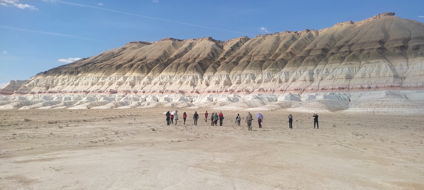 Biharamuna inguruetako mendi eta arroilen artean emango dugu, geologiaren bitxikeria gehiago bisitatzen: Airakti izeneko “gazteluetako” bailarak sedimentuen kolore ezberdinak erakusten dizkigu bere dorreetan. Ordu laurdenez autoz ibilita Xumani mendira helduko gara. Errusiako tsarren gobernuak Taras Xevtxenko olerkari ukrainarra Mangystaura erbesteratu zuen XIX. mendearen erdialdean. Debekatua bazuen ere, margolari lanari eutsi zion, bere koadernoetan hemengo natura islatu nahian. Geologia aldetik denbora gutxi igaro da ordutik eta lapitzez eginiko marrazki haiek aurrez aurre ditugu orain. Tulipa sogdiarra loratzen ari da egunotan. Atzean, mendiaren letagin zorrotzak daude, zerura zuzenduta.
