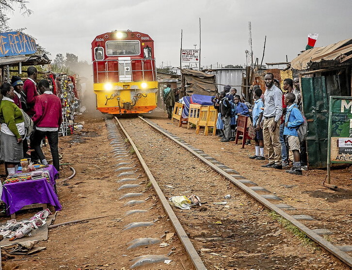 Nairobiko aldiriko trena Kiberako auzo marjinaletako trenbide jendetsuan barrena doa. Esaten dutenez, Afrikako auzo pobrerik handiena da Kibera; baita mundukoa ere, zenbaiten ustetan.