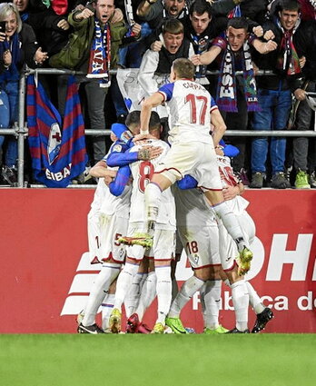 Jugadores del Athletic celebrando el decisivo penalti anotado por Unai Gómez.