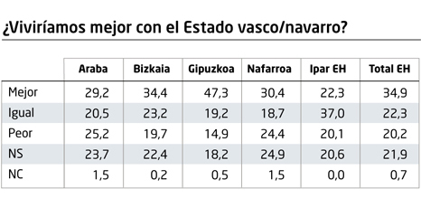 Al norte del Bidasoa, únicamente el 20,1% (una décima menos que en el total de Euskal Herria) considera que tener un Estado propio empeoraría su situación personal. Esta opción es escogida de modo muy homogéneo por territorios: del 14,9 de Gipuzkoa al 25,2% de Araba, que es donde más reacios se muestran, aunque absolutamente en todos los herrialdes son más los que creen que se viviría mejor que los que prevén un empeoramiento del bienestar.