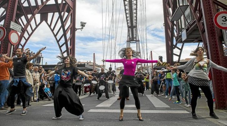 La Asociación Parkinson Nervión Ibaizabal ACAPK, que trabaja por mejorar la calidad de vida de las personas afectadas por la enfermedad de Parkinson, organizó ayer un Flashmob junto al Puente de Bizkaia bajo el lema «#Siquieresbailamos. La música nos pone ON». Buscaba dar a conocer la enfermedad e incidir en dos de sus síntomas, la rigidez y la lentitud de movimientos, y los beneficios que la música aporta a los afectados.Luis JAUREGIALTZO | ARP