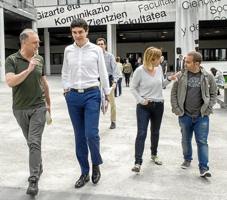 Fueron dos horas y media de debate con la comunidad universitaria en frente y preguntas en directo, vía twitter y whatsapp, que intentaron ir a lo concreto. Dieron pie a un debate diverso, clarificador de propuestas y actitudes, pero denso en la medida que eran muchas cuestiones a tratar y siete candidatos de otras tantas formaciones que concurren a los próximos comicios municipales y forales: Unai Rementeria (PNV), Carlos Fernández (PSE), Miren Larrion (EH Bildu), Roberto Uriarte (Podemos), Xabier Jiménez (IU-Irabazi), Gonzalo Zorrilla (PP) y Santiago Sainz (Ciudadanos).