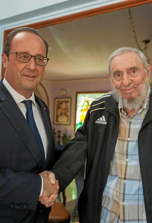 El presidente francés, François Hollande, se reunió con el líder cubano Fidel Castro y su hermano, el presidente Raúl, como colofón de una histórica visita con la que París tona la delantera en el acercamiento europeo a la Cuba del deshielo con EEUU. Precisamente, Raúl Castro anunció ayer que Washington y La Habana podrían reabrir sus respectivas embajadas el 29 de mayo, después de que EEUU retire a Cuba de su lista de países «terroristas».Alex CASTRO | AFP