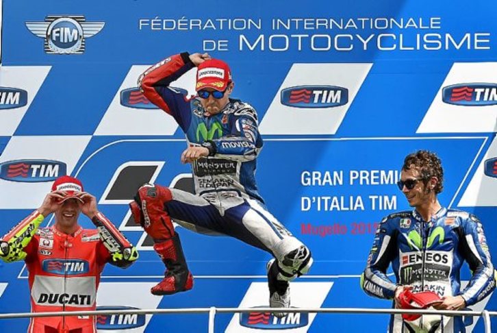 Jorge Lorenzo (Yamaha YZR M 1) sumó con autoridad su tercera victoria consecutiva de la temporada en el Gran Premio de Italia de MotoGP, que se disputó ayer en el circuito de Mugello. Con este nuevo triunfo se acerca al líder del Mundial, su compañero de equipo Valentino Rossi, que acabó tercero «su» gran premio pero dispone de seis puntos de ventaja.