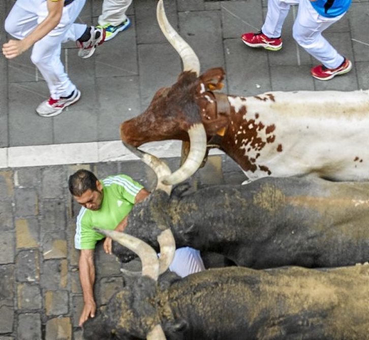 Eta zuzen-zuzen: 850 metro bi minutu eta bost segundoan zeharkatzeko, ez dago denbora galtzerik, eta zinez Miurakoek ez zuten batere galdu. Aukera batzuk izan zituzten, lasterketaren bigarren partean, batez ere Telefonicako jaitsieraren ezkerreko aldean zein zezen plazako sarreran, nahigabean pilatutako edo eroritako korrikalariak adarren aurrean aurkitu zituztenean. Baina ez batean ez bestean ez zuten eraso egiteko keinurik egin. Ikaratzeko modukoa izan zen bigarren unea, neska bati adarra gertu-gertutik pasatu zitzaiolako eta gero lurrean zen korrikalari batek ere lepotik oso hurbil nabaritu zuelako. Adarkadarik gertatu izan balitz ere, ezin zatekeen esan Miurakoaren errua izan zenik, ez baitzuen adarkatzeko inolako gogorik agertu.