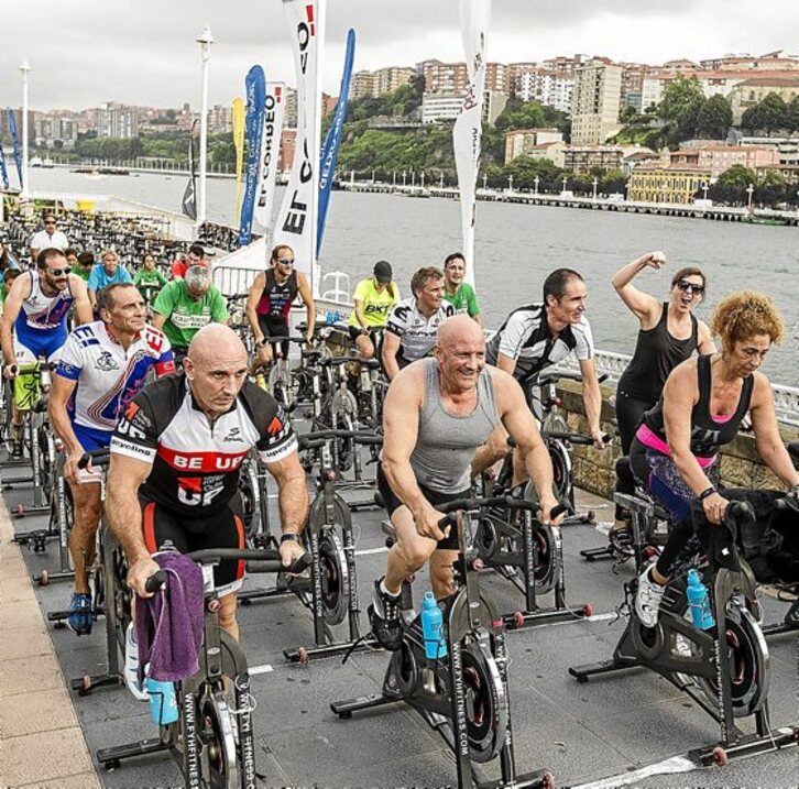 En su 25º aniversario, Erandioko Txirrindulari Elkartea se puso el reto de iluminar ayer el emblemático Puente Colgante. No hacía falta conectarse al &bs;tendido eléctrico, puesto que contaron con la energía y la ilusión de miles de personas que se turnaron cada veinte minutos para que, durante diez horas, las doscientas bicis dispuestas en las dos orillas de la ría no dejaran de rodar. Los equipos de Getxo y Portugalete competían para hacer su margen más luminosa. Al ritmo de las clases de spining, la verdadera motivación era recaudar fondos para la Fundación Stop Sanfilippo, enfermedad incurable.