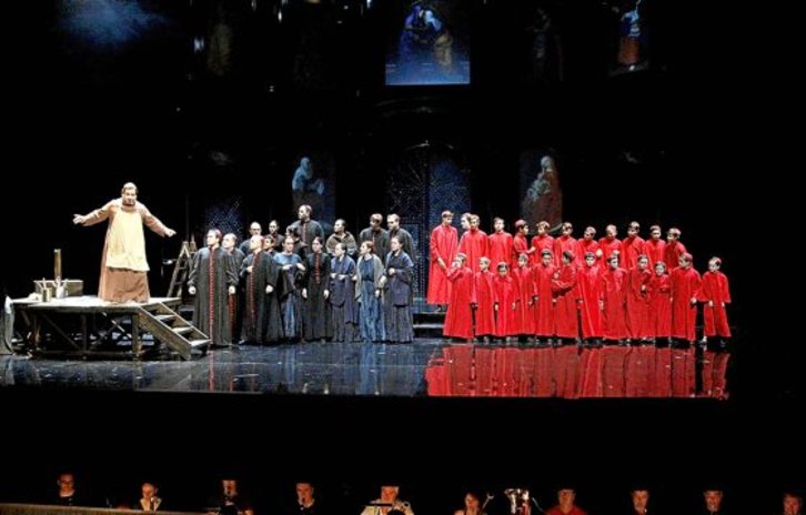 Para Paco Azorín, hombre de teatro y gran conocedor de la obra de Shakespeare, esta producción de “Tosca”, estrenada a finales de 2014, fue su primer trabajó importante en el terreno de la ópera. La recepción por parte de la crítica no fue unánime. Azorín anuncia, eso sí, que el tercer acto llega a Donostia completamente renovado con respecto a lo que se pudo ver en Barcelona y Sevilla. Se mantiene, eso sí, el impresionante retablo giratorio y una dirección de actores que da a las motivaciones de los personajes un giro de tuerca que Azorín no quiso desvelar.
