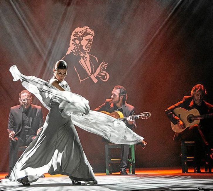 La imagen resumió a la perfección lo que es este “Voces”, en el que la bailaora gaditana rinde homenaje a las personalidades de grandes artistas del mundo del flamenco como Camarón, Enrique Morente, Paco de Lucía, Moraíto o Antonio Gades. Pero lo que se anuncia como homenaje no parece serlo tanto: aquí Camarón o Morente son básicamente una presencia testimonial, sus figuras se estampan sobre unos paneles y se les recuerda a través de fragmentos de entrevistas en las que hablan de la técnica, la emoción y la renovación del flamenco. Los genios están ahí, pero los focos apuntan exclusivamente a Sara Baras: hasta el último detalle del espectáculo gira en torno a su manera de entender el flamenco, de bailar y hacer música con su cuerpo, de su extraordinario talento para el zapateado. Un trabajo de pies que no es solo componente visual de su expresividad corporal, sino instrumento principal y base sobre la que se construye la música del espectáculo. Hasta los guitarristas y el saxofonista adoptaron formas percutivas de emitir el sonido para fundirse con los zapatos de Baras, en numerosos pasajes impactantes que eran todo un éxtasis del ruido.