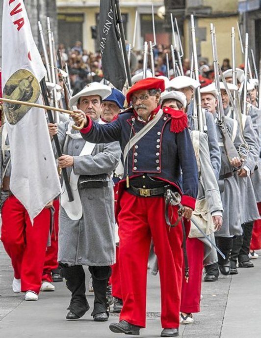 Andoaingo Gudua antzeztu zuten atzo, 2013an hasitako bideari jarraiki, 200 andoaindar inguruk. 1837ko irailaren 14an gertatu zen Lehen Karlistaldiko pasarte odoltsu hori, 800 hildako utzi zituena.Gorka RUBIO | ARGAZKI PRESS