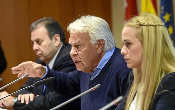 «Visité a dos condenados por la dictadura, que salieron después, en pleno estado de sitio en Chile. El estado de sitio del Chile de Pinochet respetaba mucho más los derechos humanos que el paraíso de paz y prosperidad de Maduro», afirmó Felipe González en una rueda de prensa el jueves junto a Lilian Tintori, la esposa del líder opositor venezolano Leopoldo López, condenado a prisión por asociación para delinquir e incitar a la violencia durante las protestas antigubernamentales que se saldaron con más de 40 muertos.