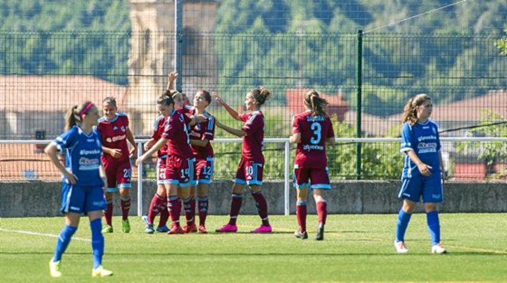 La Real se impuso al Oiartzun por 4-1 en el partido amistoso disputado ayer en el campo de fútbol de Harane a beneficio de Kilometroak 2015, fiesta de las ikastolas guipuzcoanas que este año se celebrará en Usurbil el próximo 4 de octubre. Eguzkiñe Peña (2), Izaskun Leoz y Manuela Lareo fueron las autoras de los goles realistas. En la imagen celebran uno de ellos. El encuentro sirvió de test para próximos compromisos ligueros.Juanan RUIZ | ARGAZKI PRESS
